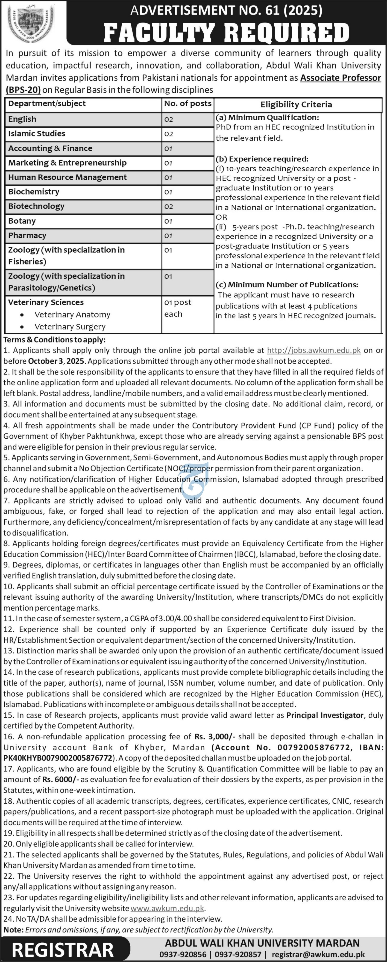 Abdul Wali Khan University announced new jobs for the position of Associate Professor. These jobs are related to Teaching category and Government jobs. The minimum qualification required for this job is Master, Mphil, Phd.