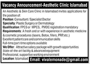 Aesthetic Clinic announced new jobs for the position of Consultant, Specialist Doctor. These jobs are related to Medical category and Government jobs. The minimum qualification required for this job is MBBS, P.G Diploma, Others.