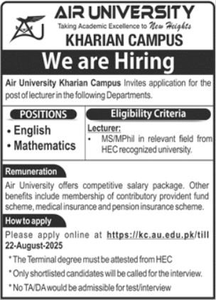 Air University announced new jobs for the position of Lecturer, English Lecturer, Maths Lecturer. These jobs are related to Education category and Government jobs. The minimum qualification required for this job is Bachelor, Master, Mphil, MS, BS.