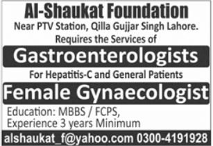 Al Shaukat Foundation announced new jobs for the position of Gastroenterologist, Female Gynaecologist. These jobs are related to Medical category and Government jobs. The minimum qualification required for this job is MBBS, P.G Diploma, Others.
