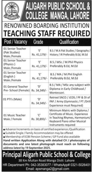 Aligarh Public School & College announced new jobs for the position of Pakistan Studies Teacher, Physics Teacher, English Teacher, General Teacher, Pti Teacher, Music Teacher, Male Teacher, Female Teacher. These jobs are related to Education category and Government jobs. The minimum qualification required for this job is Bachelor, Master, MA, BS.