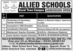 Allied Schools announced new jobs for the position of Elementary School Teacher Est, Accountant, Cro, Coordinator, Montessori Teacher, Jr Section Teacher. These jobs are related to Education category and Government jobs. The minimum qualification required for this job is Bachelor, Master, MS, BS.