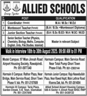 Allied Schools announced new jobs for the position of Coordinator, Montessori Teacher, Physics Teacher, Chemistry Teacher, Biology Teacher, Maths Teacher, Computer Teacher, English Teacher, Urdu Teacher, Pak Studies Teacher, Islamiat Teacher. These jobs are related to Education category and Government jobs. The minimum qualification required for this job is Bachelor, Master, MS, BS.