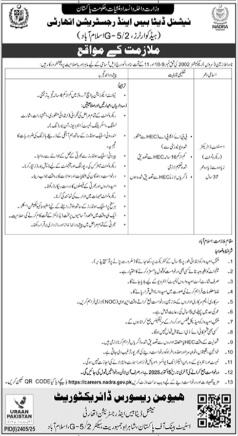 National Database & Registration Authority NADRA announced new jobs for the position of Assistant Director Recruitment. These jobs are related to Management category and Government jobs. The minimum qualification required for this job is Bachelor, Master.