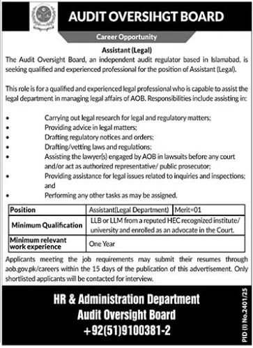 Audit Oversight Board AOB announced new jobs for the position of Assistant Legal. These jobs are related to Management category and Government jobs. The minimum qualification required for this job is LLb, LLM.