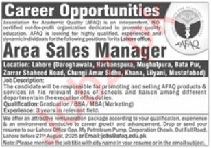 Association for Academic Quality AFAQ announced new jobs for the position of Area Sales Manager. These jobs are related to Sales category and Government jobs. The minimum qualification required for this job is Bachelor.