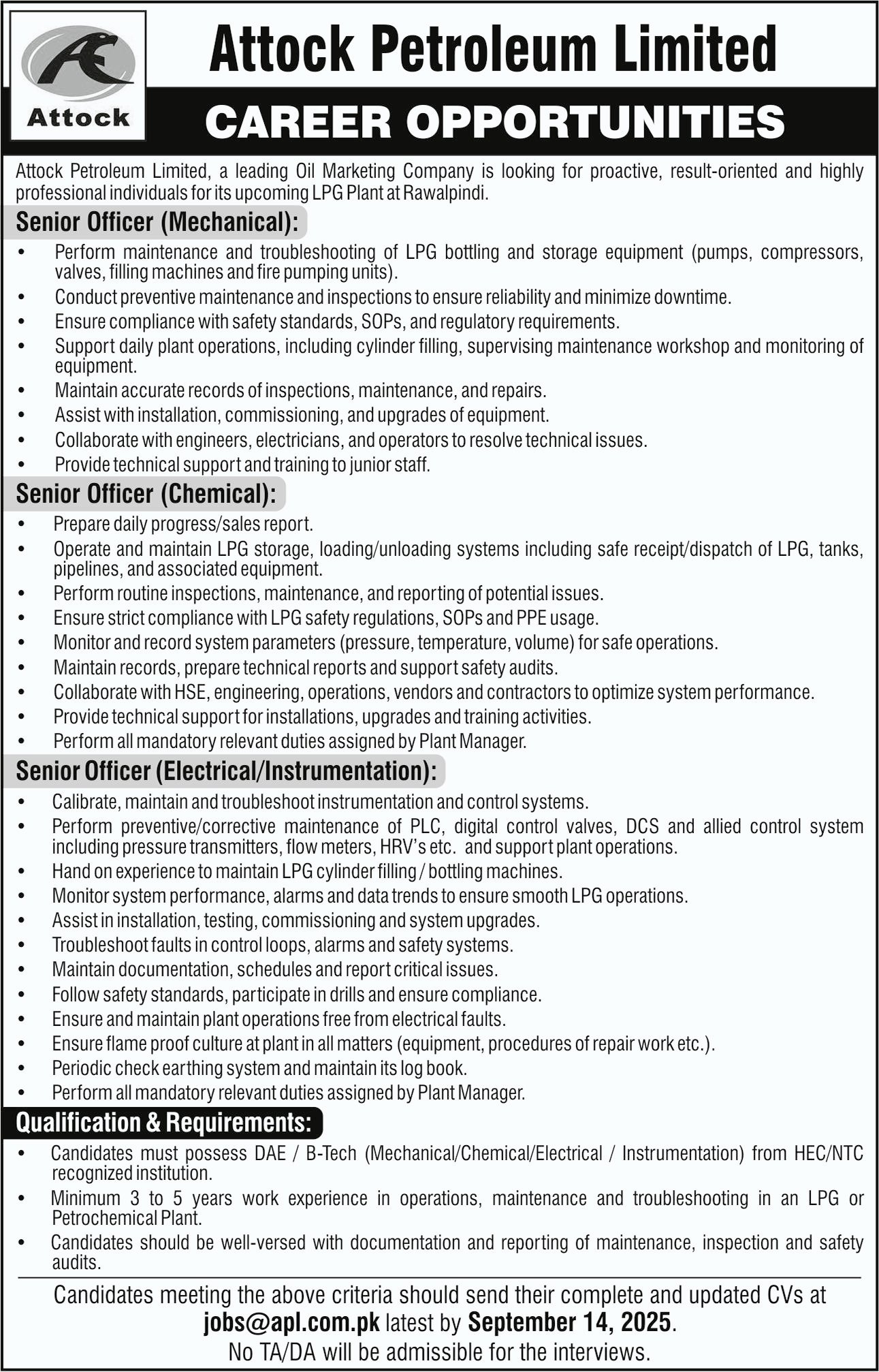 Attock Petroleum Limited APL announced new jobs for the position of Mechanical Technician, Chemical Technician, Electrical Technician, Mechanical Officer, Chemical Officer, Electrical Officer, Instrumentation Technician, Senior Officer. These jobs are related to Manufacturing category and Government jobs. The minimum qualification required for this job is Intermediate, Bachelor, DAE, B.E, Others, BS.