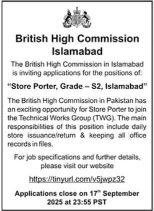 British High Commission Islamabad announced new jobs for the position of Store Porter Grade S2. These jobs are related to Management category and Government jobs. The minimum qualification required for this job is Bachelor.