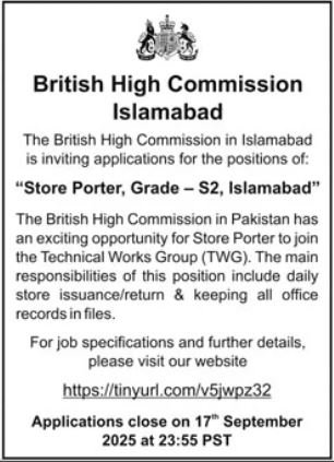 British High Commission Islamabad announced new jobs for the position of Store Porter. These jobs are related to Embassy category and Government jobs. The minimum qualification required for this job is Intermediate, Bachelor.