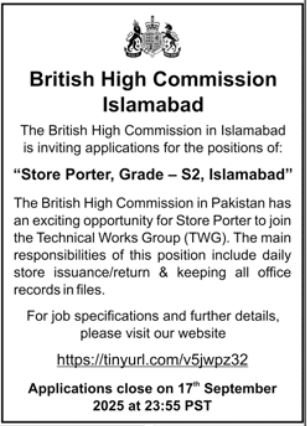 British High Commission Islamabad announced new jobs for the position of Store Porter, Store Porter Grade S2. These jobs are related to Embassy category and Government jobs. The minimum qualification required for this job is Intermediate, Bachelor.