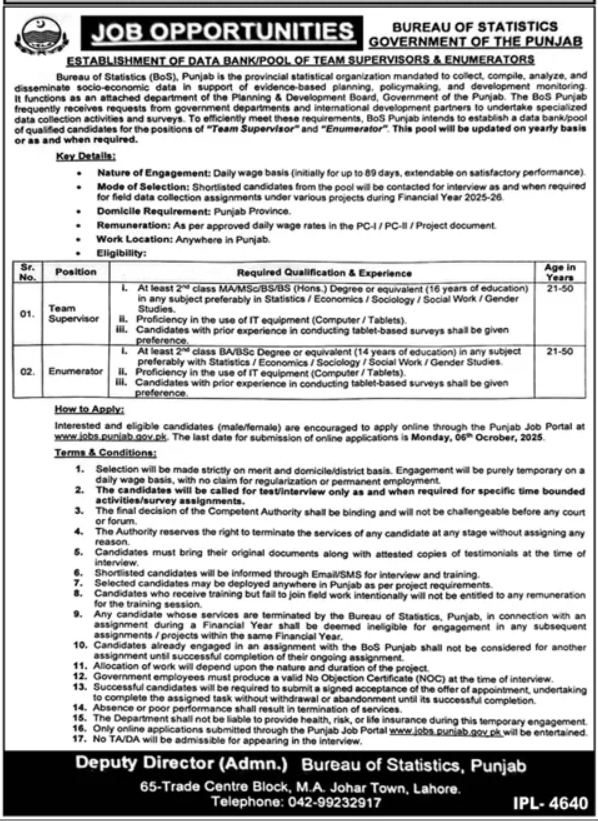 Bureau of Statistics announced new jobs for the position of Team Supervisor, Enumerator. These jobs are related to Management category and Government jobs. The minimum qualification required for this job is Bachelor, Master, MS, BS.