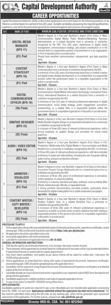 Capital Development Authority CDA announced new jobs for the position of DIGITAL MEDIA MANAGER, CONTENT STRATEGIST, DIGITAL COMMUNICATION OFFICER, GRAPHIC DESIGNER, AUDIO, VIDEO EDITOR, ANIMATOR, VISUALIZER, CONTENT WRITER, COPY WRITER, DEVELOPER. These jobs are related to Management category and Government jobs. The minimum qualification required for this job is Bachelor, Master.