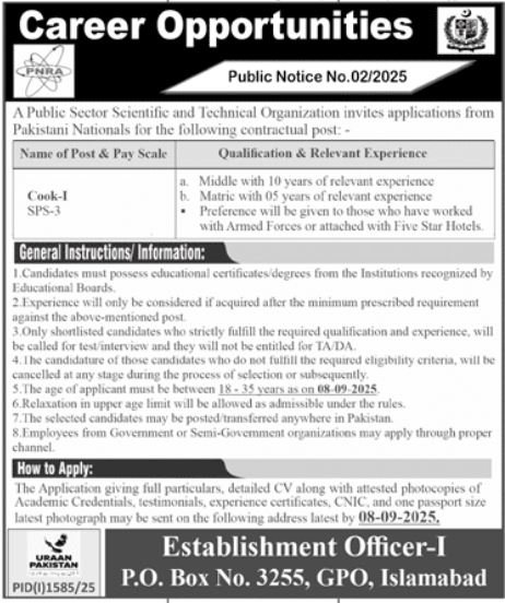 Public Sector Scientific & Technical Organization announced new jobs for the position of Cook. These jobs are related to Management category and Government jobs. The minimum qualification required for this job is Middle, Matric.