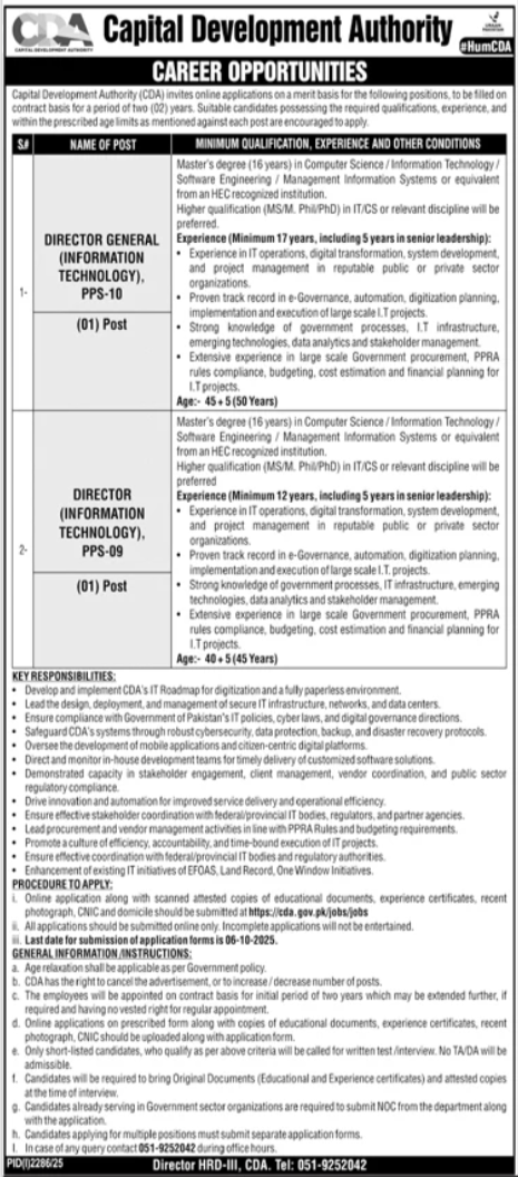Capital Development Authority CDA announced new jobs for the position of Director General, Director General Information Technology, Director, Director Information Technology. These jobs are related to Management category and Government jobs. The minimum qualification required for this job is Master, Mphil, Phd, MS.