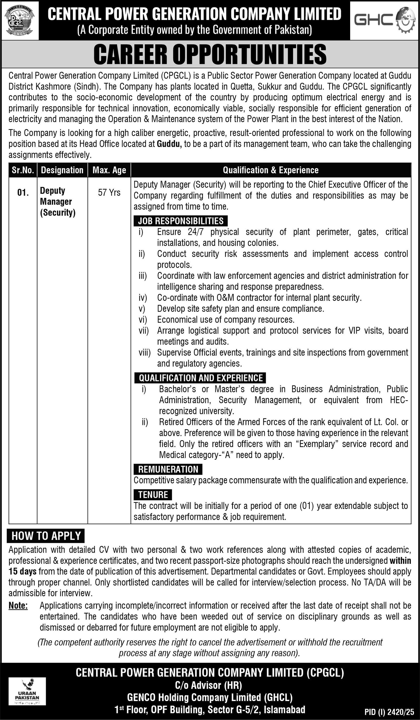 Central Power Generation Company Ltd announced new jobs for the position of Deputy Manager Security. These jobs are related to Management category and Government jobs. The minimum qualification required for this job is Bachelor, Master, MS, BS.