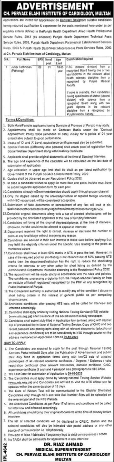 Chaudhary Pervaiz Elahi Institute of Cardiology announced new jobs for the position of Technician Pathology. These jobs are related to Management category and Government jobs. The minimum qualification required for this job is Intermediate.