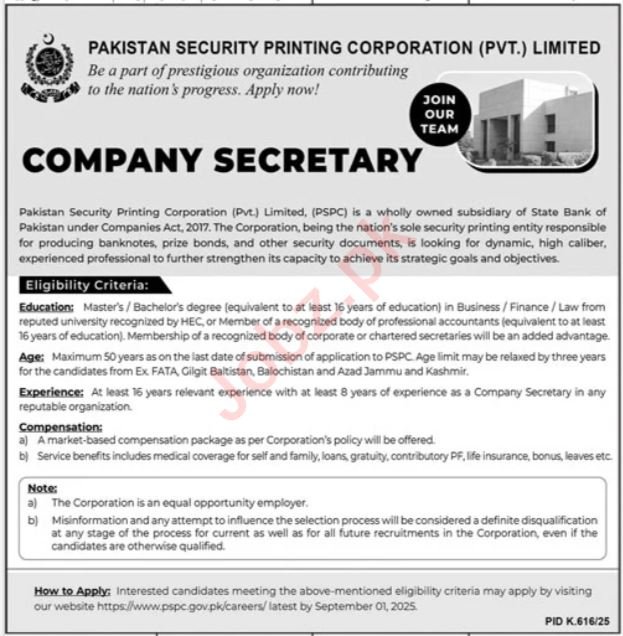 Pakistan Security Printing Corporation Pvt Ltd announced new jobs for the position of Company Secretary. These jobs are related to Management category and Government jobs. The minimum qualification required for this job is Bachelor, Master.