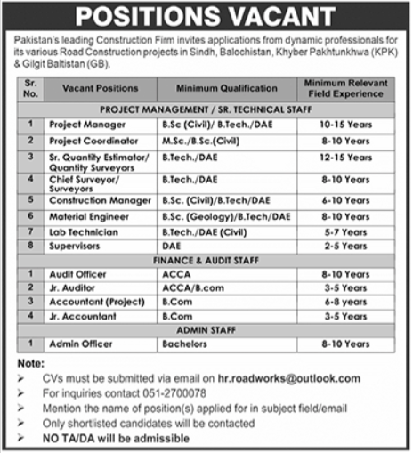 Construction Firm announced new jobs for the position of Project Manager, Project Coordinator, Quality Estimator, Quantity Surveyor, Chief Surveyor, Surveyor, Construction Manager, Material Engineer, Lab Technician, Supervisor, Audit Officer, Auditor, Accountant, Admin Officer. These jobs are related to Management category and Government jobs. The minimum qualification required for this job is Intermediate, Bachelor, B.com, DAE.
