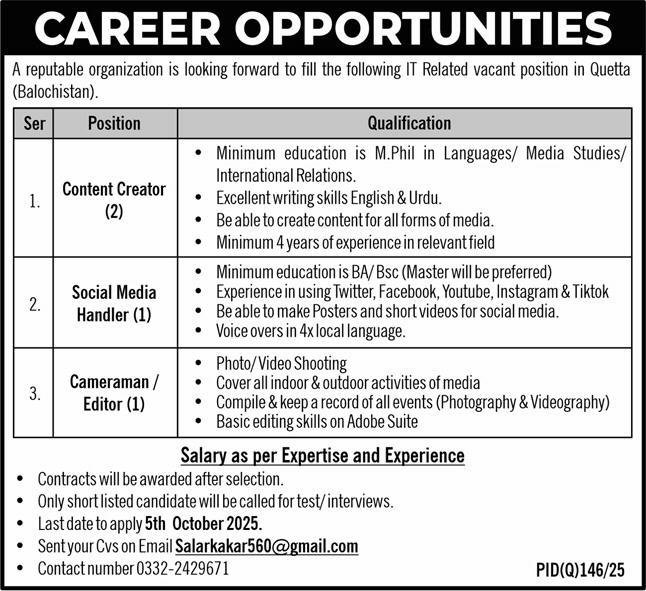 The job is located in Quetta and it is necessary for candidate to read mentioned requirements for available vacancies. Express newspaper published this job ad on 21 September, 2025. Last date to apply this job is 05 October, 2025