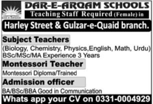 Dar e Arqam Schools Pakistan announced new jobs for the position of Teacher, Subject Teacher, Biology Teacher, Chemistry Teacher, Physics Teacher, English Teacher, Maths Teacher, Urdu Teacher, Montessori Teacher, Admission Officer. These jobs are related to Teaching category and Government jobs. The minimum qualification required for this job is Bachelor, Master.