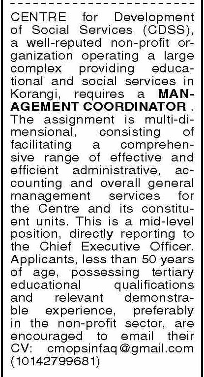 Centre for Development of Social Services CDSS announced new jobs for the position of Management Coordinator, Coordinator. These jobs are related to NGO category and Government jobs. The minimum qualification required for this job is Bachelor, Master.