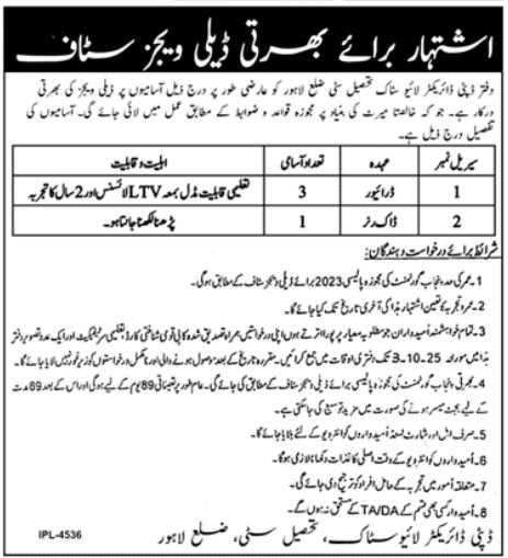 Director Live Stock announced new jobs for the position of Driver, Dak Runner. These jobs are related to Management category and Government jobs. The minimum qualification required for this job is Primary, Middle.