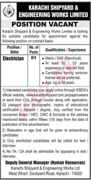 Karachi Shipyard and Engineering Works Limited announced new jobs for the position of Electrician. These jobs are related to Engineering category and Government jobs. The minimum qualification required for this job is Matric, DAE.