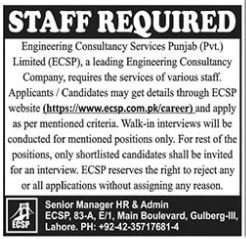 Engineering Consultancy Services Punjab ECSP announced new jobs for the position of Male Staff, Female Staff. These jobs are related to Management category and Government jobs. The minimum qualification required for this job is Bachelor, Master, MS, BS.
