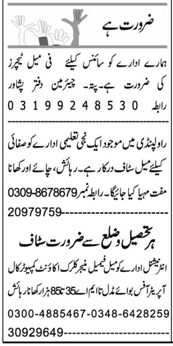 Private Company announced new jobs for the position of Teacher, Female Teacher, Science Teacher, Sweeper, Manager, Female Manager, Clerk, Accountant, Computer Call Operator, Office Boy. These jobs are related to Customer Service category and Government jobs. The minimum qualification required for this job is Middle, Matric, Intermediate, Bachelor, BA, B.com, Others.