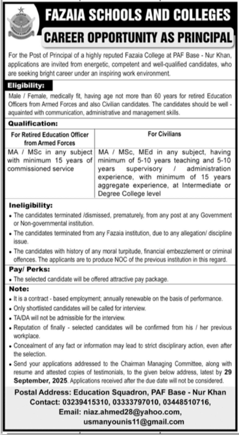 Fazaia Schools and Colleges announced new jobs for the position of Principal. These jobs are related to Teaching category and Government jobs. The minimum qualification required for this job is M.ed, MA, M.sc.