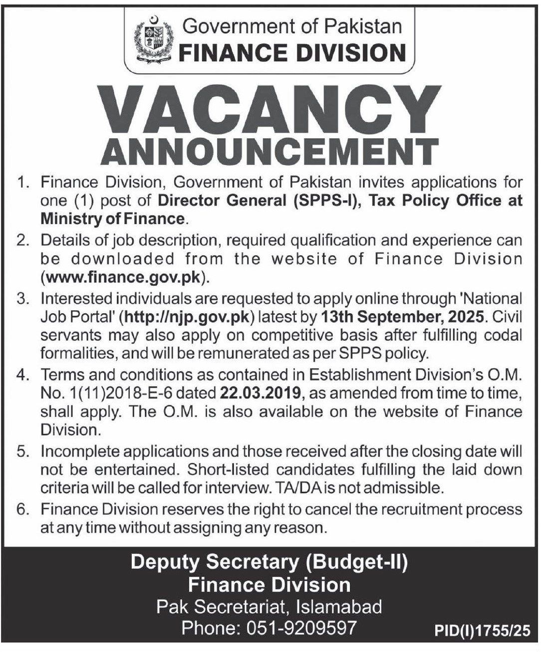 Ministry of Finance announced new jobs for the position of Director General, Director General Tax Policy. These jobs are related to Management category and Government jobs. The minimum qualification required for this job is Bachelor, Master.