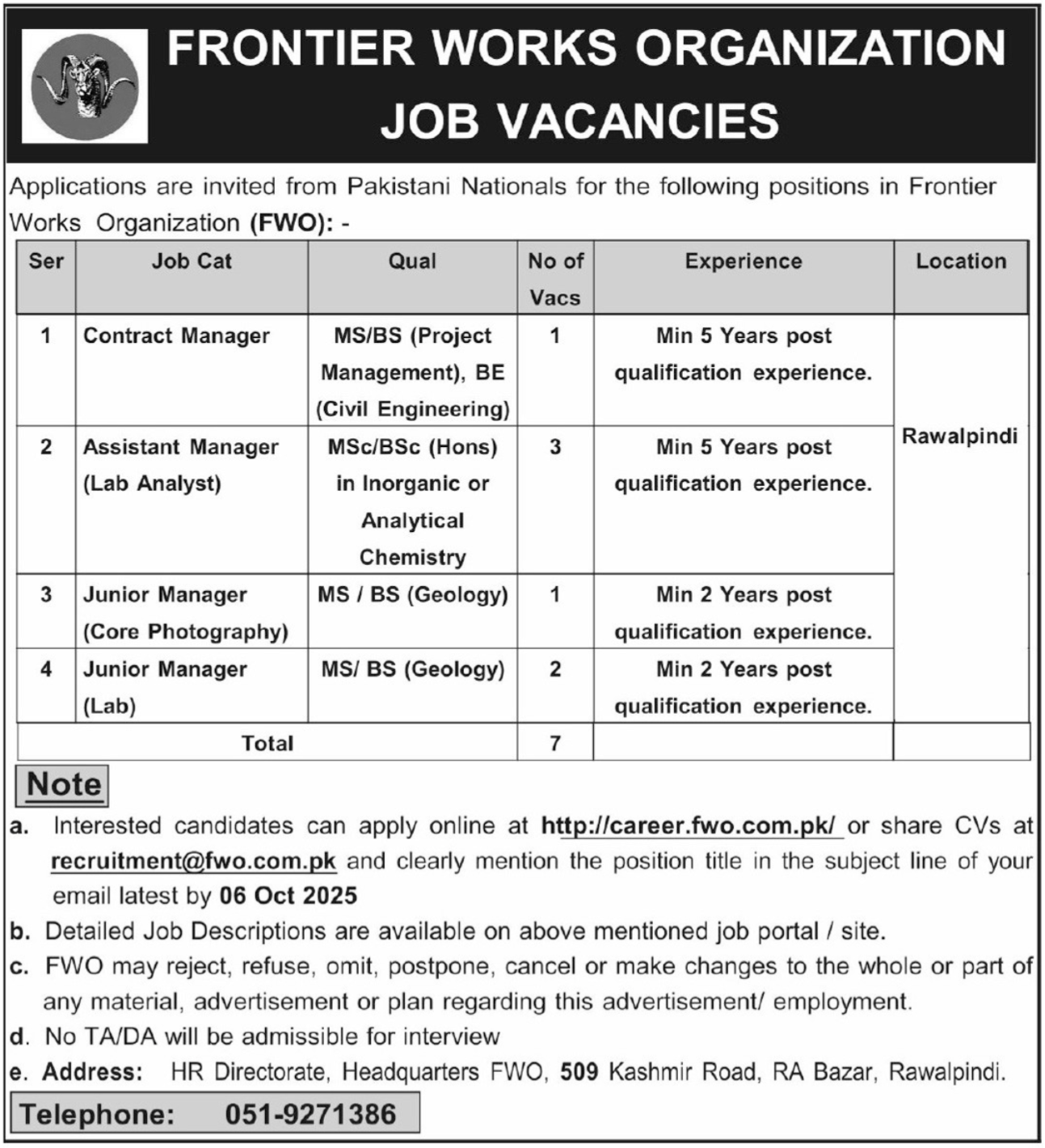 Frontier Works Organization FWO announced new jobs for the position of Contract Manager, Assistant Manager, Manager, Manager Lab. These jobs are related to Management category and Government jobs. The minimum qualification required for this job is Bachelor, Master, MS, BS.