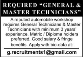 Automobiles Company announced new jobs for the position of General Technician, Master Technician. These jobs are related to Engineering category and Government jobs. The minimum qualification required for this job is Matric, Intermediate, DAE.