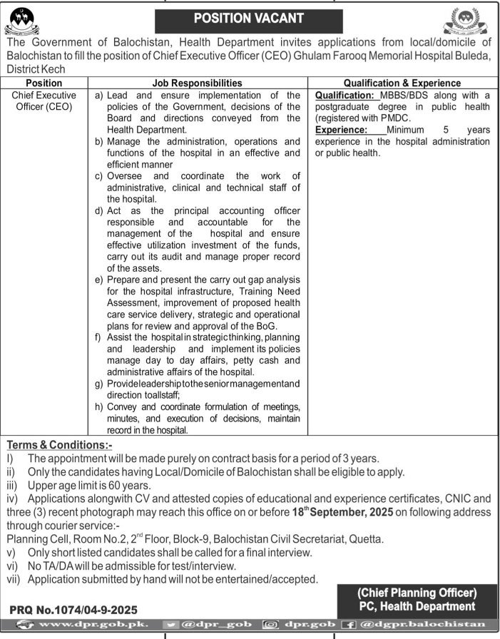 The job is located in Kech and it is necessary for candidate to read mentioned requirements for available vacancies. Other newspaper published this job ad on 06 September, 2025. Last date to apply this job is 18 September, 2025