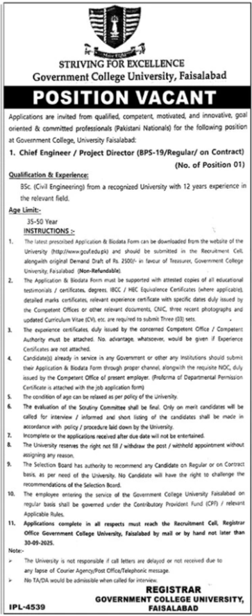Government College University Faisalabad announced new jobs for the position of Chief Engineer, Project Director. These jobs are related to Education category and Government jobs. The minimum qualification required for this job is Bachelor, BS.