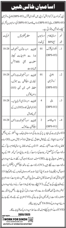 Government Organization announced new jobs for the position of Inquiry Clerk, Dhobi, Washer Man, Mali, Naib Qasid. These jobs are related to Management category and Government jobs. The minimum qualification required for this job is Primary, Middle, Matric, Intermediate.