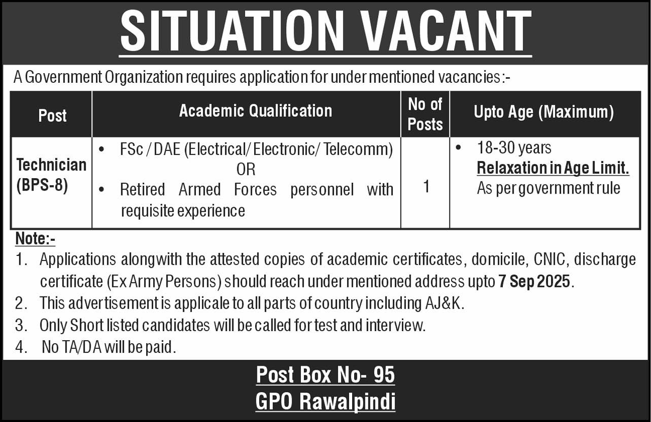 The job is located in Rawalpindi and it is necessary for candidate to read mentioned requirements for available vacancies. Other newspaper published this job ad on 21 August, 2025. Last date to apply this job is 07 September, 2025
