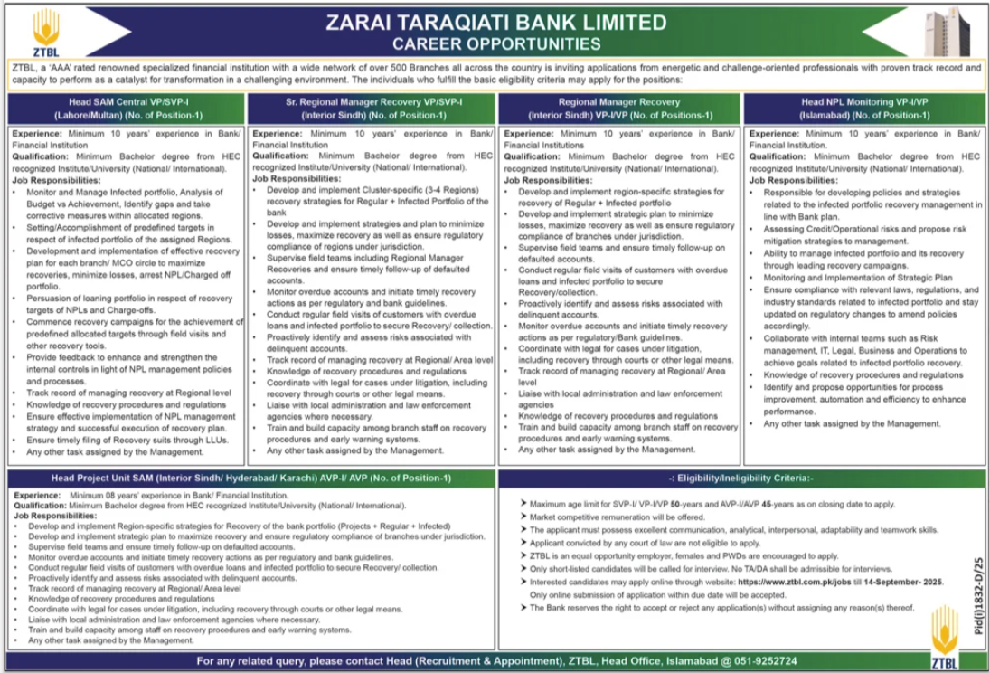 Zarai Taraqiati Bank Limited ZTBL announced new jobs for the position of Head SAM Central VP SVP-I, Sr Regional Manager Recovery VP SVP I, Regional Manager Recovery, Head NPL Monitoring VP VP I, Head Project Unit Sam. These jobs are related to Management category and Government jobs. The minimum qualification required for this job is Bachelor, Master.
