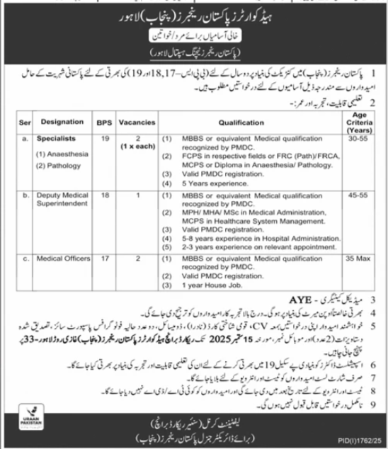 Pakistan Rangers announced new jobs for the position of Anaesthesia Specialist, Pathology Specialist, Deputy Medical Superintendent, Medical Officer. These jobs are related to Medical category and Government jobs. The minimum qualification required for this job is MBBS, M.sc, Others.