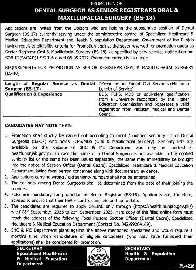 Specialized Healthcare & Medical Education Department announced new jobs for the position of Dental Surgeon, Registrar, Registrar Maxillofacial Surgery. These jobs are related to Medical category and Government jobs. The minimum qualification required for this job is MBBS, BDS, Others.
