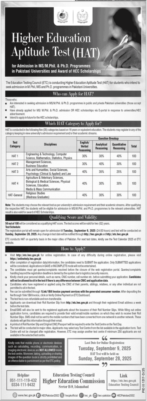 Higher Education Commission HEC announced new jobs for the position of Higher Education Aptitude Test Hat. These jobs are related to Management category and Government jobs. The minimum qualification required for this job is Bachelor, Master, MS, BS.
