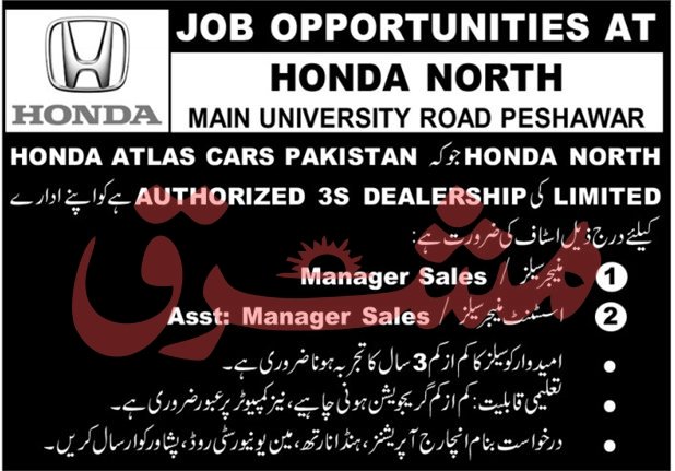 Honda North Company announced new jobs for the position of Manager Sales, Assistant Manager Sales. These jobs are related to Management category and Government jobs. The minimum qualification required for this job is Bachelor, Master, MS, BS.