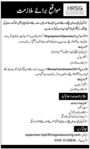 HRSG Outsourcing Pvt Limited announced new jobs for the position of Equiment Operator, Ramp Coordinator. These jobs are related to Management category and Government jobs. The minimum qualification required for this job is Middle, Matric, Intermediate.