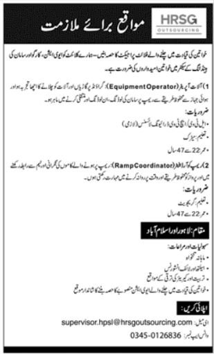 HRSG Outsourcing Pvt Limited announced new jobs for the position of Equipment Operator, Ramp Coordinator. These jobs are related to Management category and Government jobs. The minimum qualification required for this job is Middle, Matric, Intermediate.
