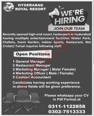 Hyderabad Royal Resort announced new jobs for the position of General Manager, Restaurant Manager, Marketing Manager, Marketing Officer, Cashier, Accountant. These jobs are related to Management category and Government jobs. The minimum qualification required for this job is Bachelor, Master.