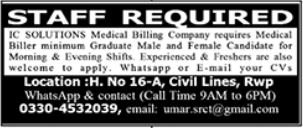 IC Solutions Medical Billing Company announced new jobs for the position of Medical Biller, Male Staff, Female Staff. These jobs are related to Management category and Government jobs. The minimum qualification required for this job is Bachelor, Master, MS, BS.