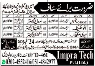 Impra Tech announced new jobs for the position of Ac Technician, Auto Mechanic, Heavy Mechanic, Civil Engineer, Electrical Engineer, Mechanical Engineer. These jobs are related to Management category and Government jobs. The minimum qualification required for this job is Matric, Intermediate, Bachelor.
