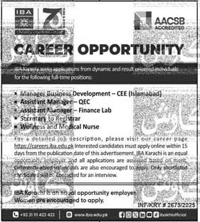 Institute of Business Administration IBA announced new jobs for the position of Manager Business Development Cee, Assistant Manager Qec, Assistant Manager Finance Lab, Secretary To Registrar, Wellness Medical Nurse. These jobs are related to Management category and Government jobs. The minimum qualification required for this job is Bachelor, Master, MS, BS.