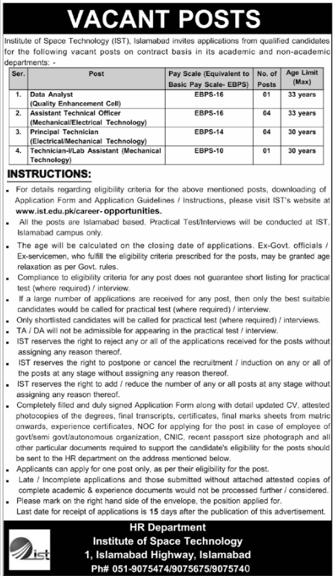 Institute of Space Technology IST announced new jobs for the position of Data Analyst, Data Analyst Qec, Assistant Technical Officer, Principal Technician, Technician, Lab Assistant. These jobs are related to Management category and Government jobs. The minimum qualification required for this job is Bachelor, Master.