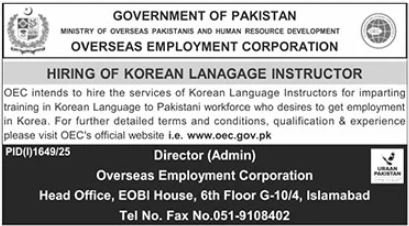 Overseas Employment Corporation OEC announced new jobs for the position of Korean Language Instructor. These jobs are related to Education category and Government jobs. The minimum qualification required for this job is Bachelor.